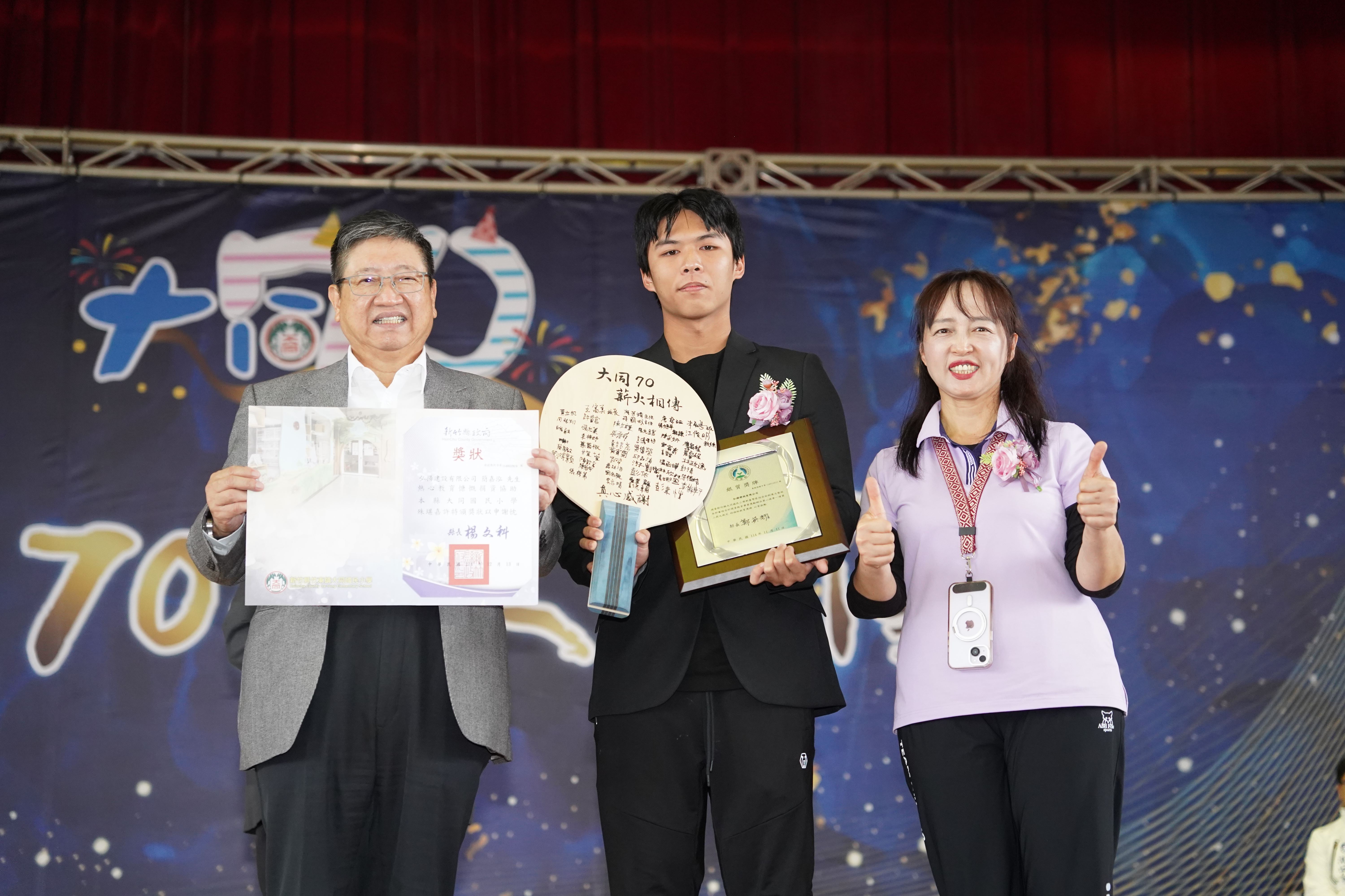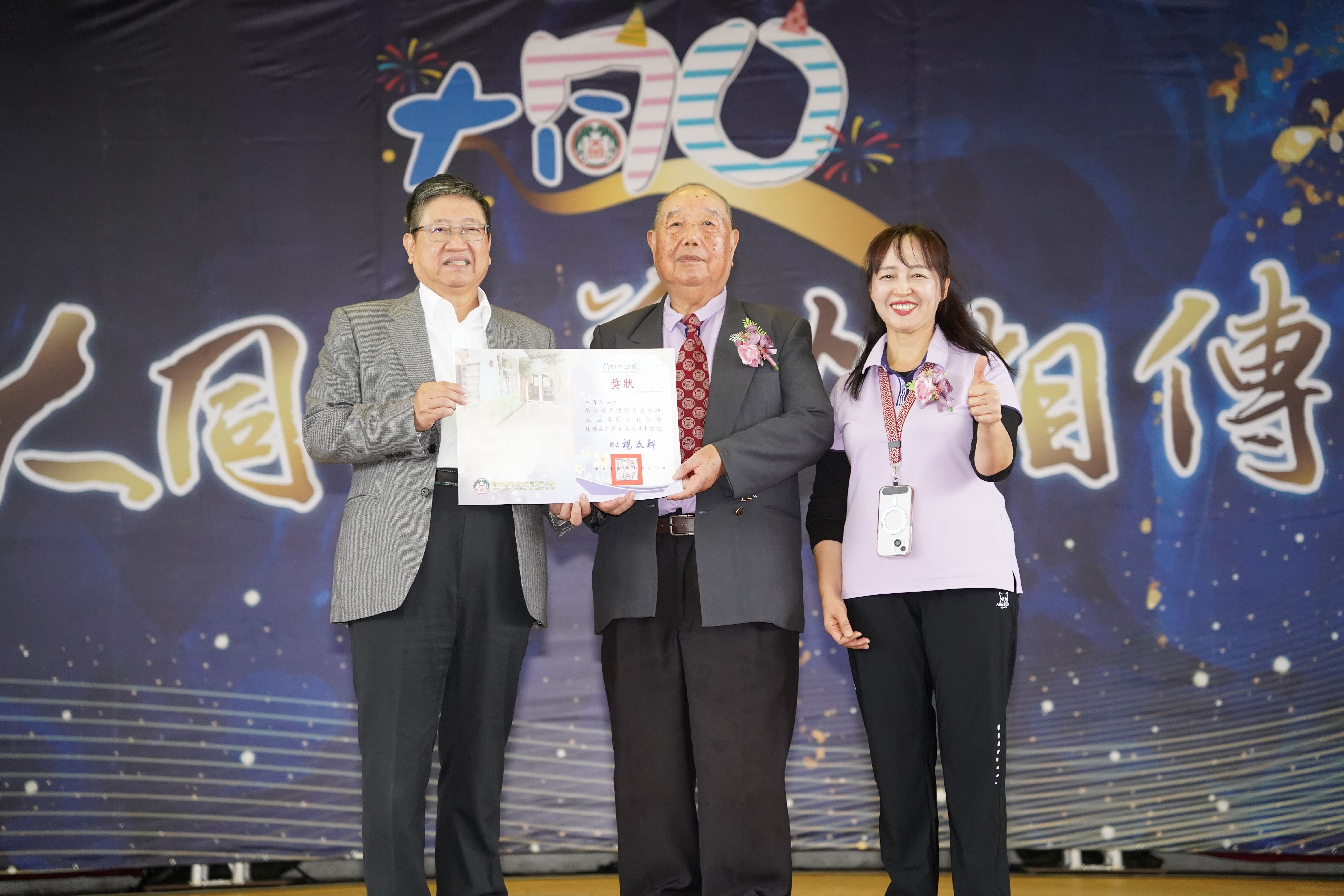 竹東大同國小校慶活動在太鼓與舞獅表演中熱鬧展開,縣長楊文科不僅致詞慶賀,更親自頒發「教育部捐資興學獎牌」,感謝弘揚建設有限公司、秉誠建設有限公司簡嘉泓先生、彭智晧先生、范鏡煉先生,捐贈市值278萬元的活動中心冷氣設備。榮譽會長林清治先生因捐贈市值50萬元以上的珍貴亞杉木材供作校慶主題木雕,亦獲頒發「捐資興學獎狀」表揚 。