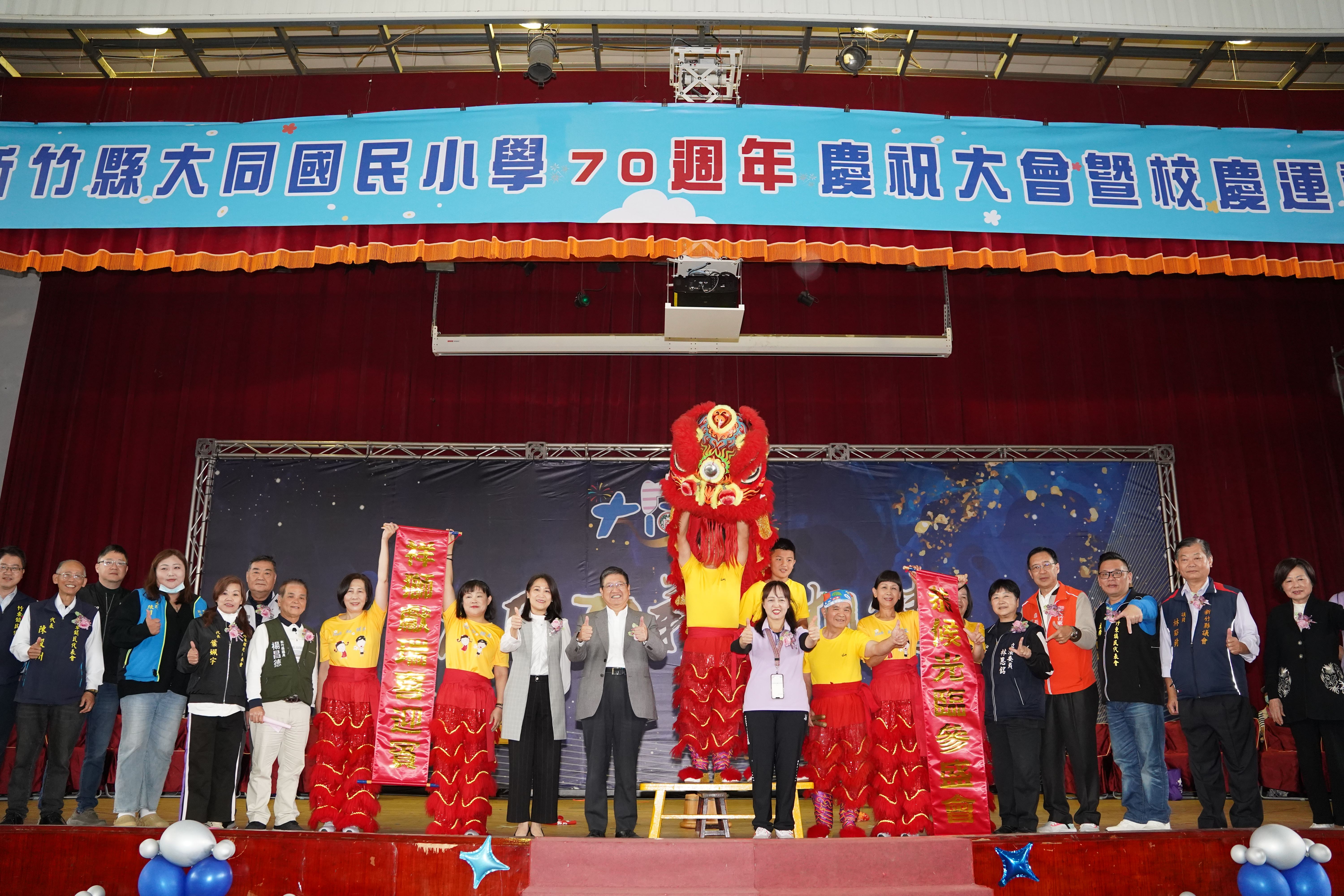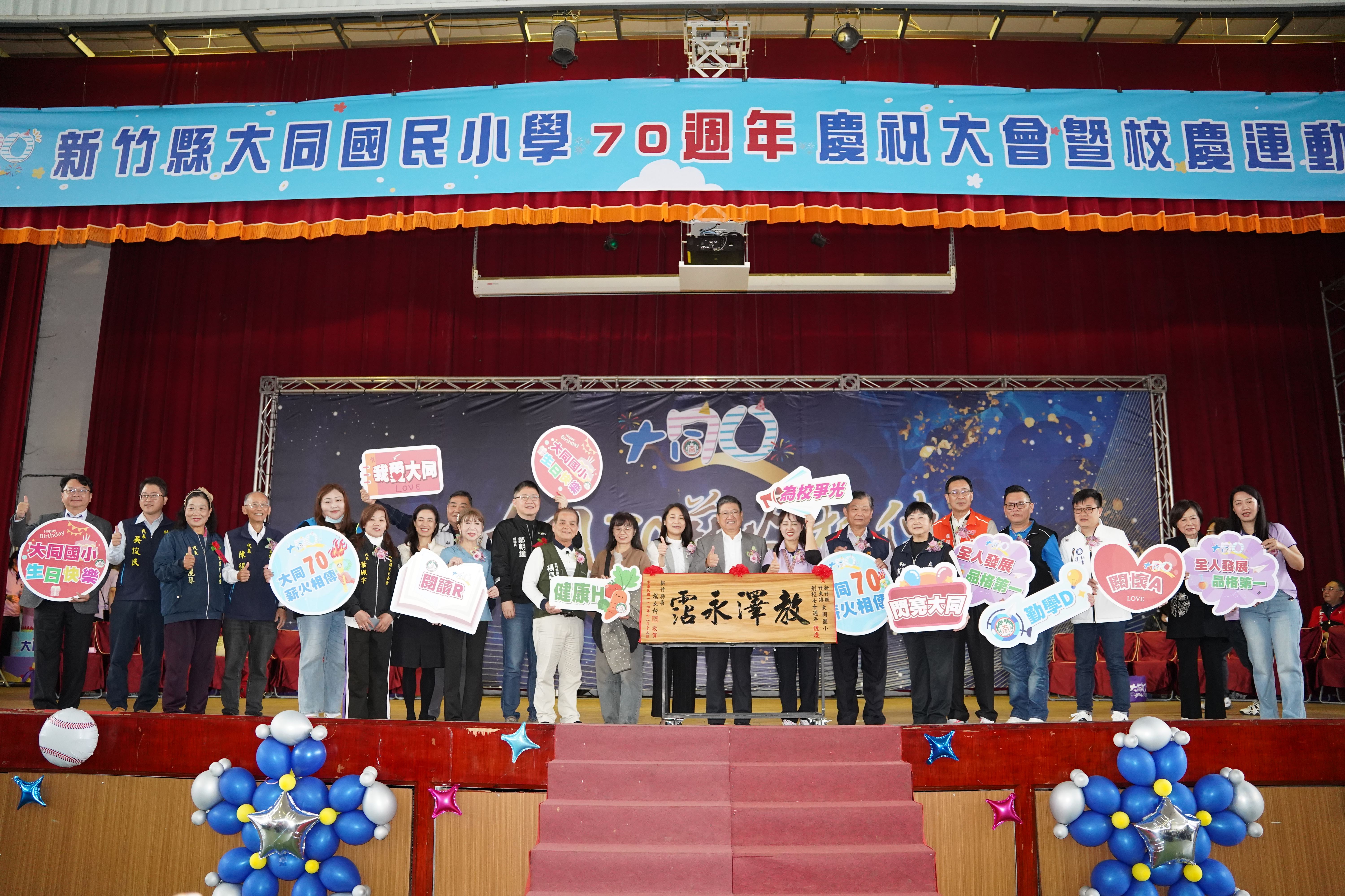 新竹縣竹東鎮大同國民小學於12月13日上午在學校活動中心及操場盛大舉辦70週年校慶「大同七十.薪火相傳」慶祝大會及運動會,縣長楊文科親臨現場頒贈「教澤永霑」匾額祝賀,並特別表彰多位興學義舉人士,典禮隨後進行溫馨的切蛋糕慶生儀式,氣氛熱鬧溫馨。