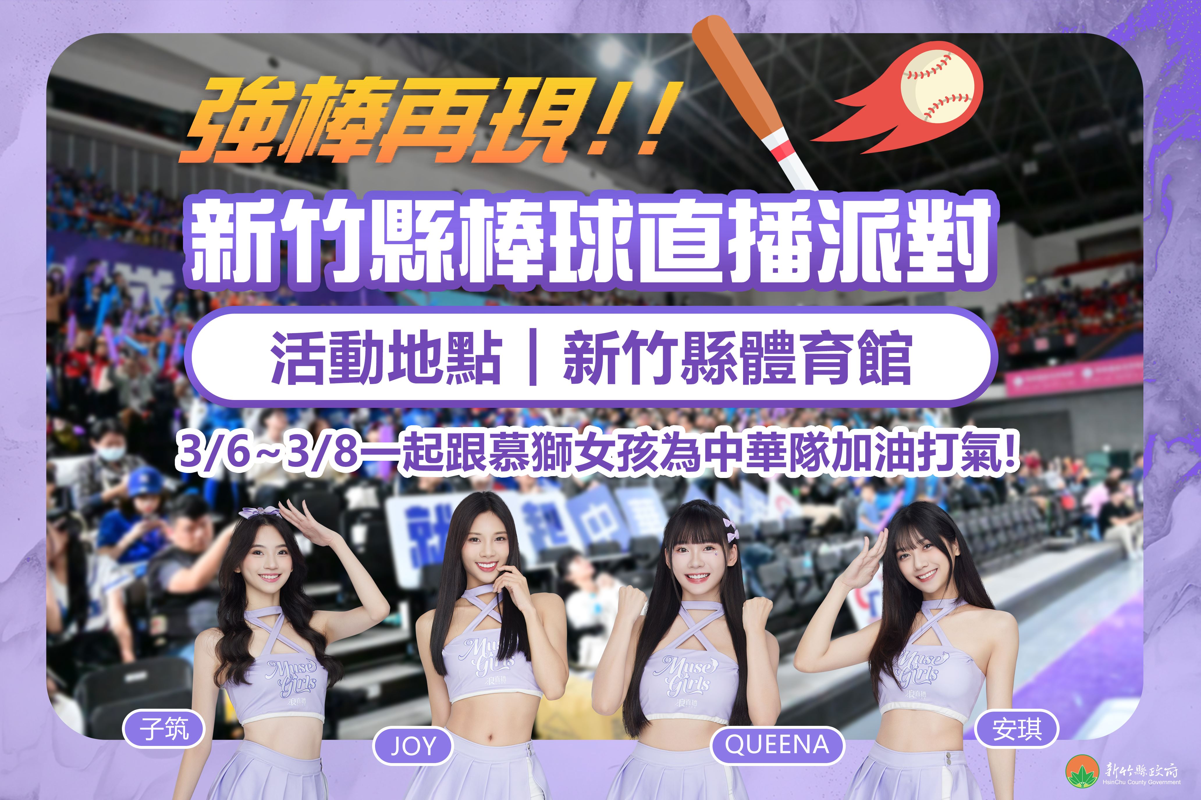 新竹縣政府將於3月6日至3月8日連續三天,在新竹縣體育館辦理「2026世界棒球經典賽」Live Party轉播活動,特別邀請慕獅女孩QUEENA、子筑、JOY、安琪一同應援,現場每日準備限量應援小物,前2000名完成活動粉絲專頁按讚者即可獲得限量加油棒1份。縣長楊文科誠摯邀請縣民朋友到場一起為中華隊集氣,爭取進軍美國邁阿密8強賽事!